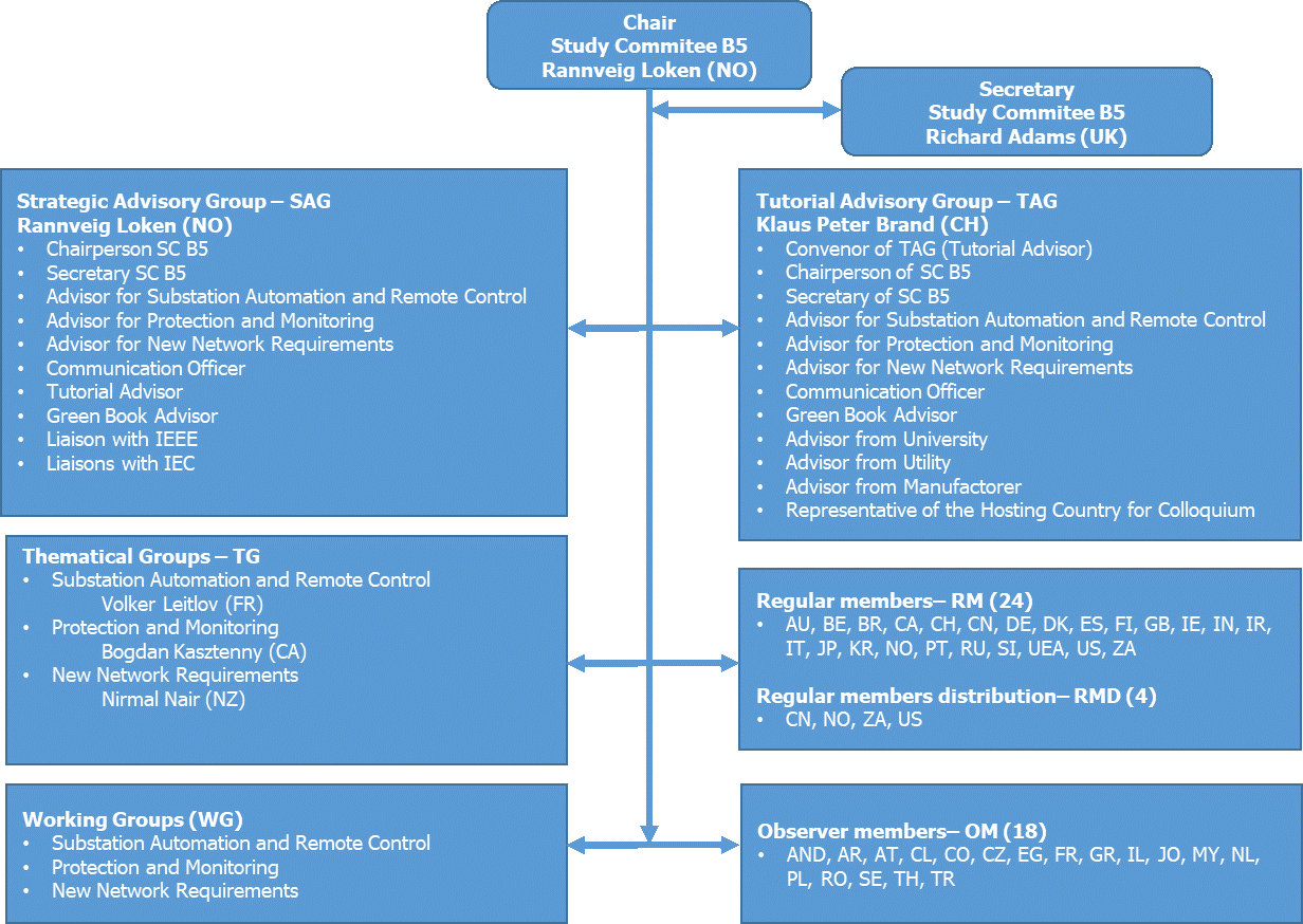 To attain its objectives, SC B5 is organized as shown on Picture 1. Five Advisory Groups support the decisions of the Chair and Secretary: the Strategic Advisory Group (SAG), the Tutorial Advisory Group (TAG), and three Strategic Thematic Groups (TG) specialized in Substation and Automation, Protection and Monitoring, and New Network Requirements, respectively. The Study Committee is formed by twenty-four regular country Members, four additional regular Members from distribution, eighteen observer Members, several Working Groups (WG) and Joint Working Groups with other Study Committees and organizations.