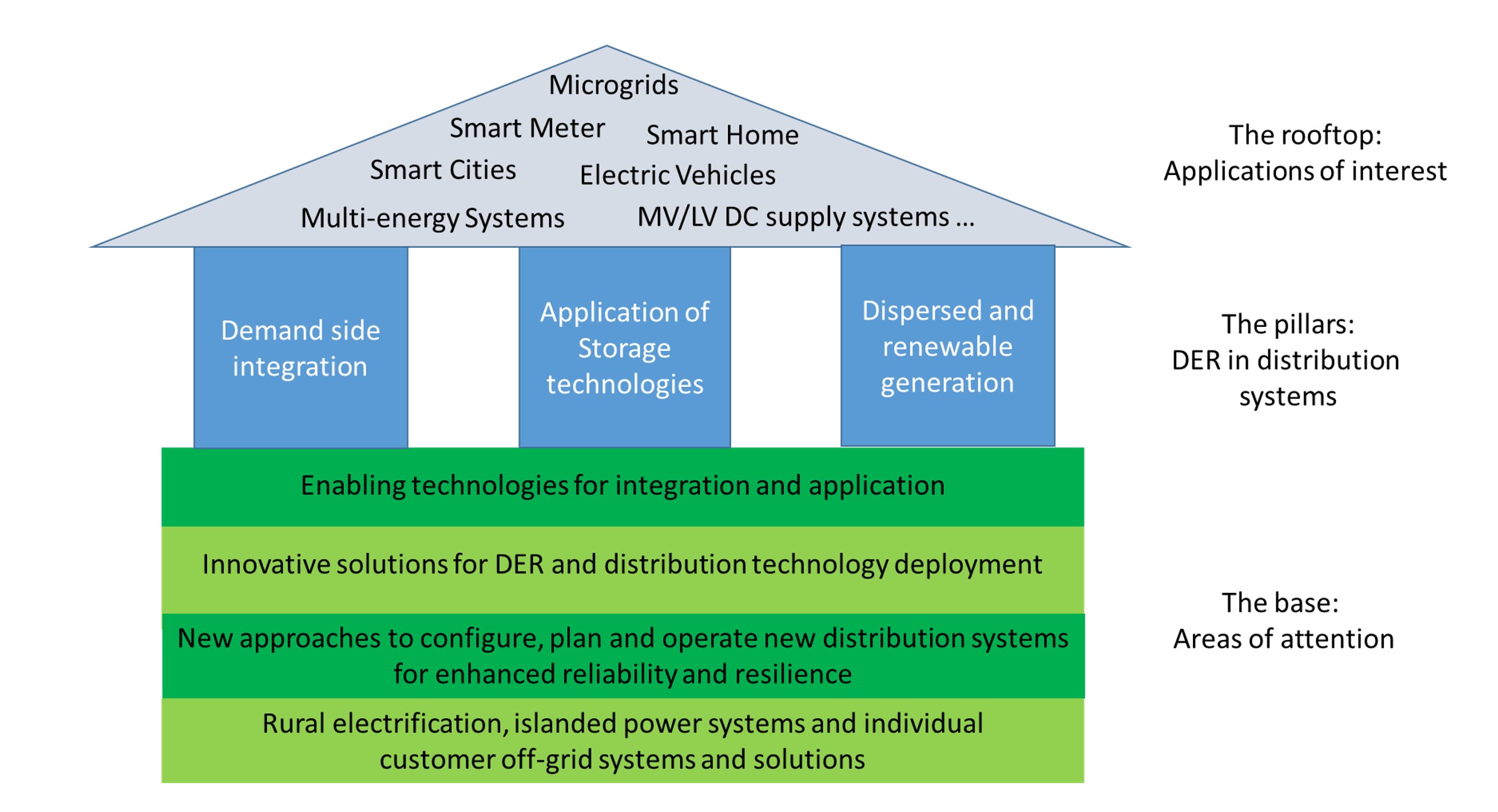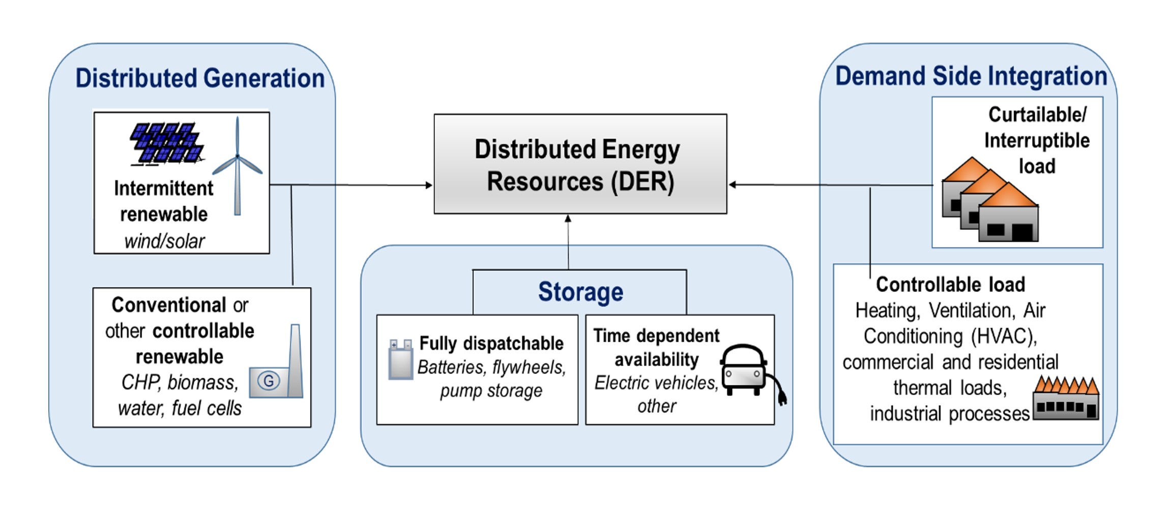 - Enabling DER technologies (pillars) – Distributed generation including conventional (diesel, gas turbines, CHP), renewable resources (wind and solar) based generation, energy storage systems (battery energy storage, thermal and inertial storage), and demand response (controllable and curtailable loads); innovative equipment and systems for DER technology deployment (inverter interfaces).