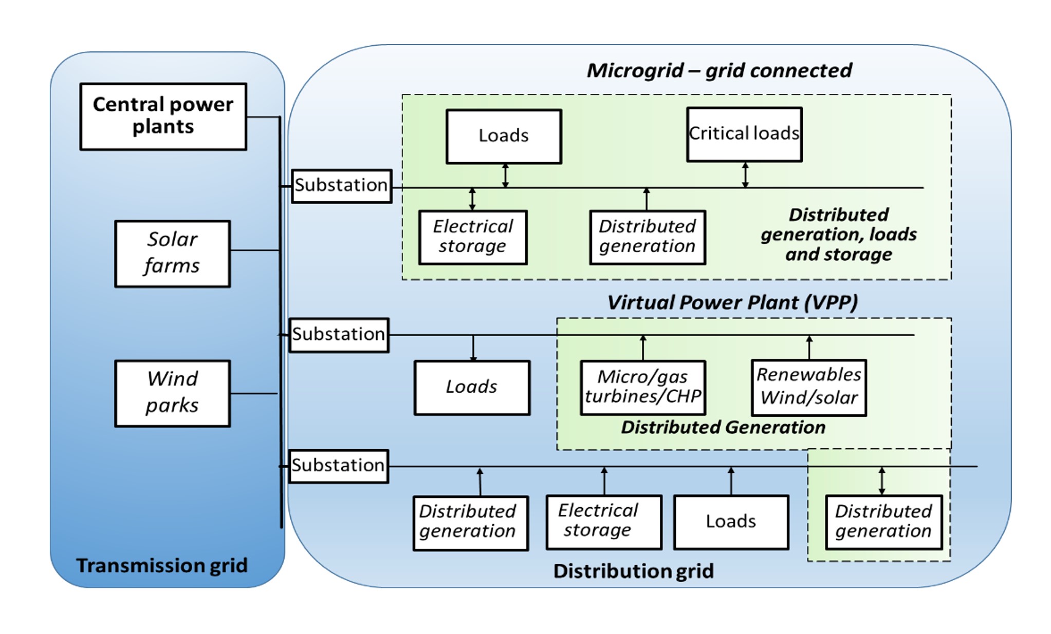 Distributed generation, an element in the DER assets, includes generation from renewable energy resources, mostly solar and wind power. These resources are variable and intermittent and need to be balanced to provide dispatchable power. This can be achieved using electricity storage (batteries) and demand response. In addition, distributed generation assets, individually, usually provide small amounts of power. Aggregation of DER is an effective way of managing a large number of DER, including smaller solar panels and battery energy storage systems at the residential and commercial levels. This can be achieved using concepts and tools such as microgrids, virtual power plants (VPP), Figure 2, or software platforms such as distribution management systems (DERMS) that aggregate DER over a wider area.