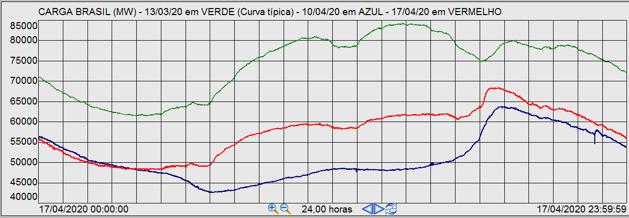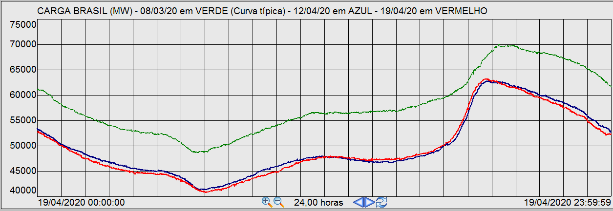 Figure 2 - Comparison of Daily Load Curves – TYPICAL (March 8 – green) x Verified (April 19 – red) x Previous week (April 12 – Easter Sunday – blue). (Source: ONS)