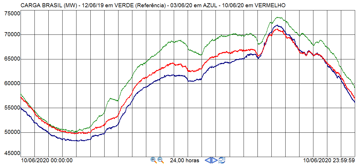 Figure 3 - Comparison of Daily Load Curves – typical (June 19, 2019 – green) x Verified (June 10, 2020 – red) x Previous week (June 3, 2020 – blue). (Source: ONS)