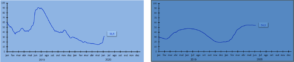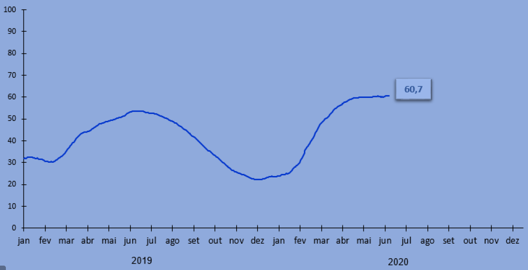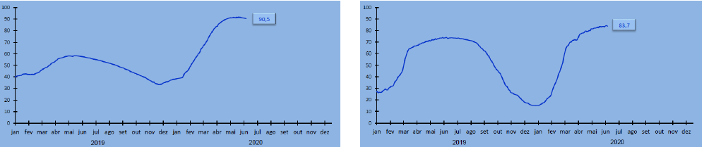 In addition to the application of efficient policies, Brazil had one of the best rainy periods for these regions than in recent years, which has already allowed favourable recovery of large Brazilian reservoirs. With the reduction in demand seen since the third week of March 2020, we are reaching excellent levels of water (energy) storage that can be confirmed by the accumulated volume values (in the equivalent reservoir concept) already surpassing the 60% mark for Brazil in June, 2020 (see Figure 4).
