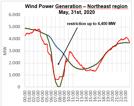 On a low consumption day, such as the one observed on May, 31, 2020, when the minimum demand in Brazil reached 40,097 MW, it was necessary to reduce the entire hydroelectric generation to its minimum possible values, around 30,000 MW (established to maintain safe operating conditions due to the need for system inertia, the ability to recover from major events, voltage control, and other minor regional limitations). Thermal generation was also reduced to the minimum possible values reaching levels around 8,000 MW. Even in the period of very low load, the wind generation in the northeast region of Brazil (where most of this type of generation is located), and with specific programming done the previous day and with values limited in relation to the forecasted amounts, had to be further restricted, reaching reductions of up to 4,400 MW - see Figure 6.