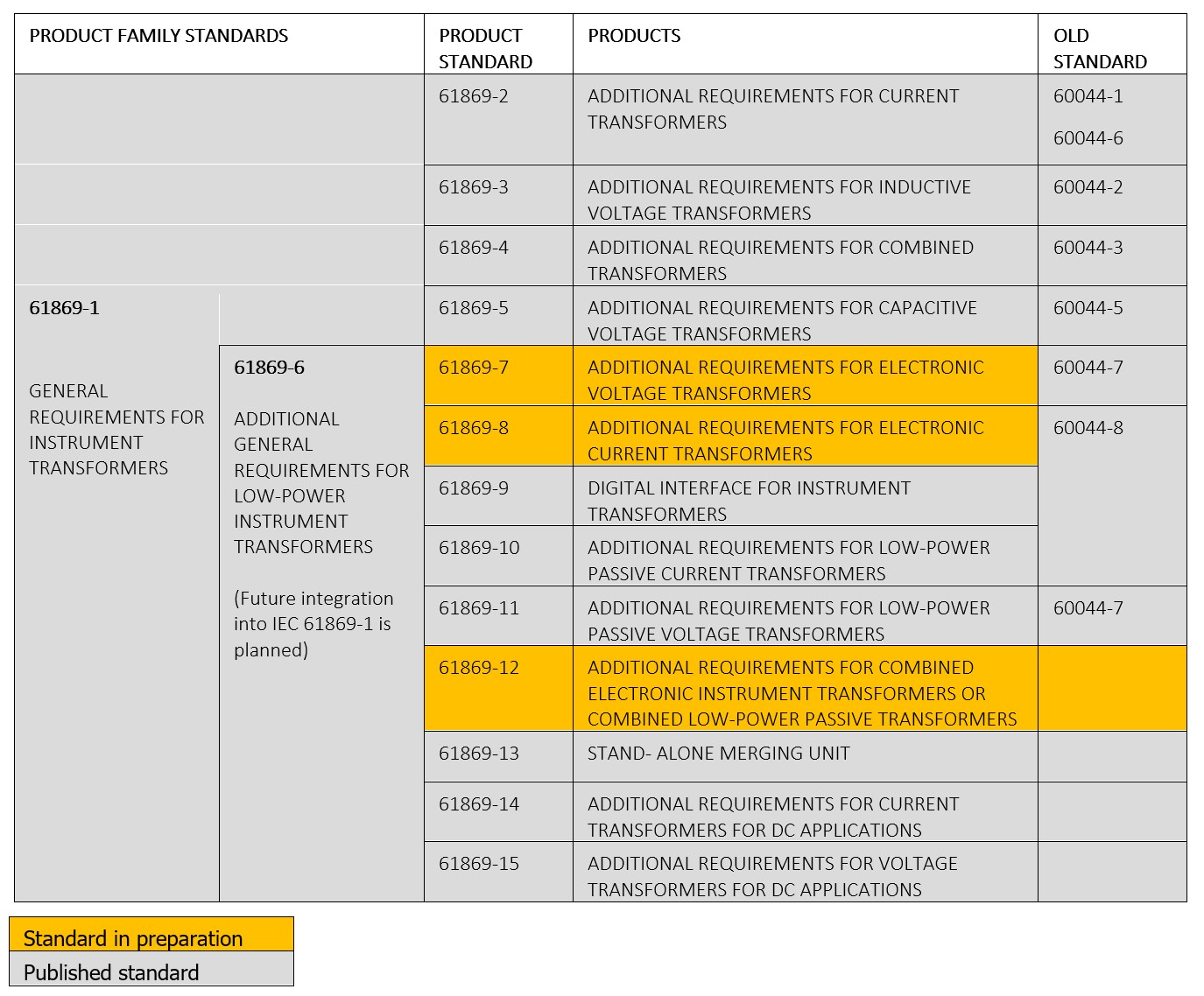 Another reason is matured standardisation. Relevant IEC standards for LPITs and Merging Units as well as for the communication are the basis for future-proof and interoperable devices. The new series IEC 61869, replacing IEC 60044, published or due to be published at the time this brochure was prepared, is presented in the following table.