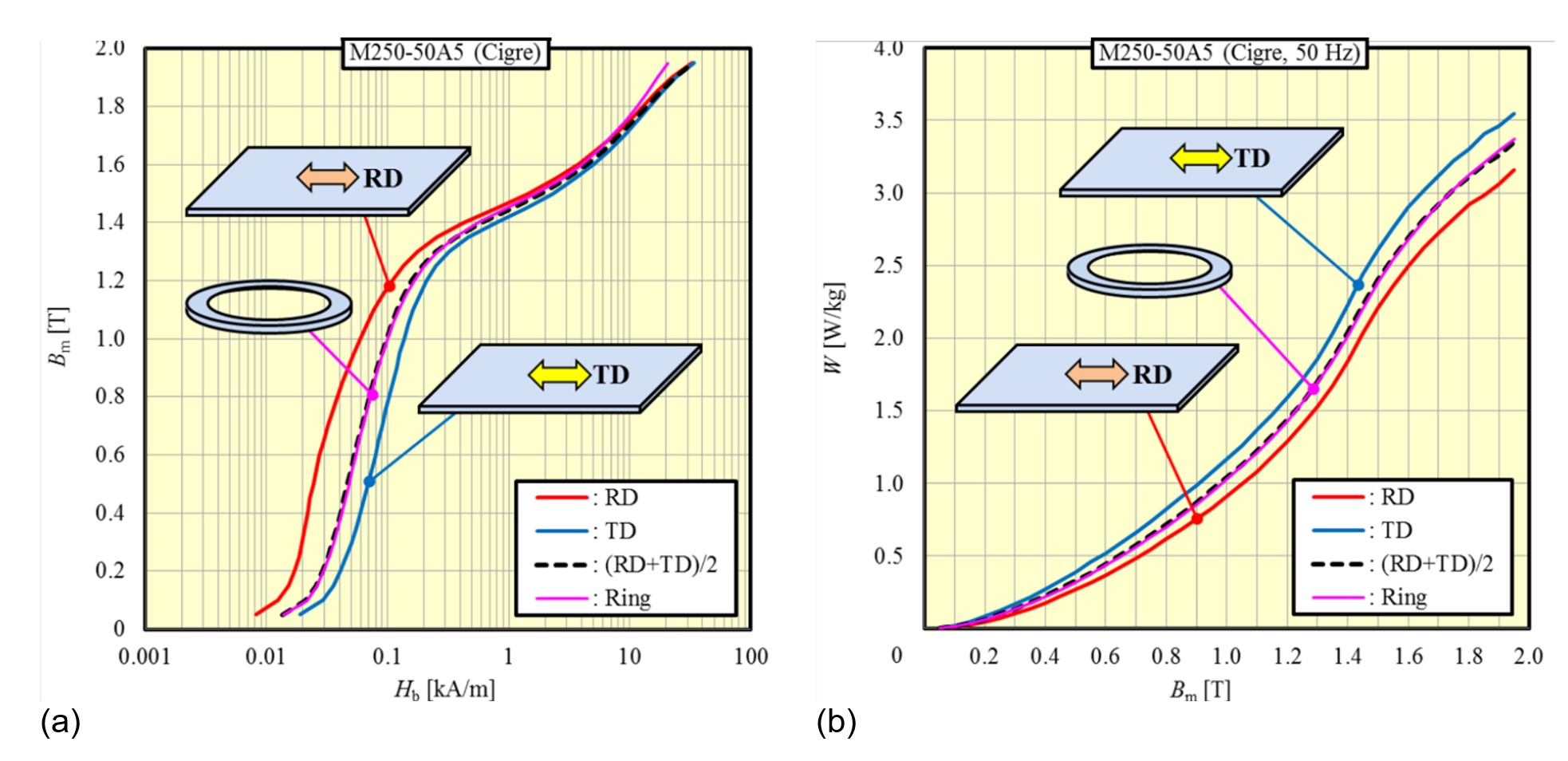 Figure 3 - Anisotropy in NGO M250-50A5 (a) Magnetic properties and (b) core loss