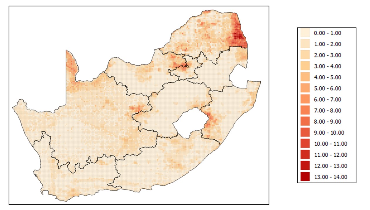 Figure 1 - Bird electrocution sensitivity map using data compiled by the South African Bird Atlas Project (SABAP2)