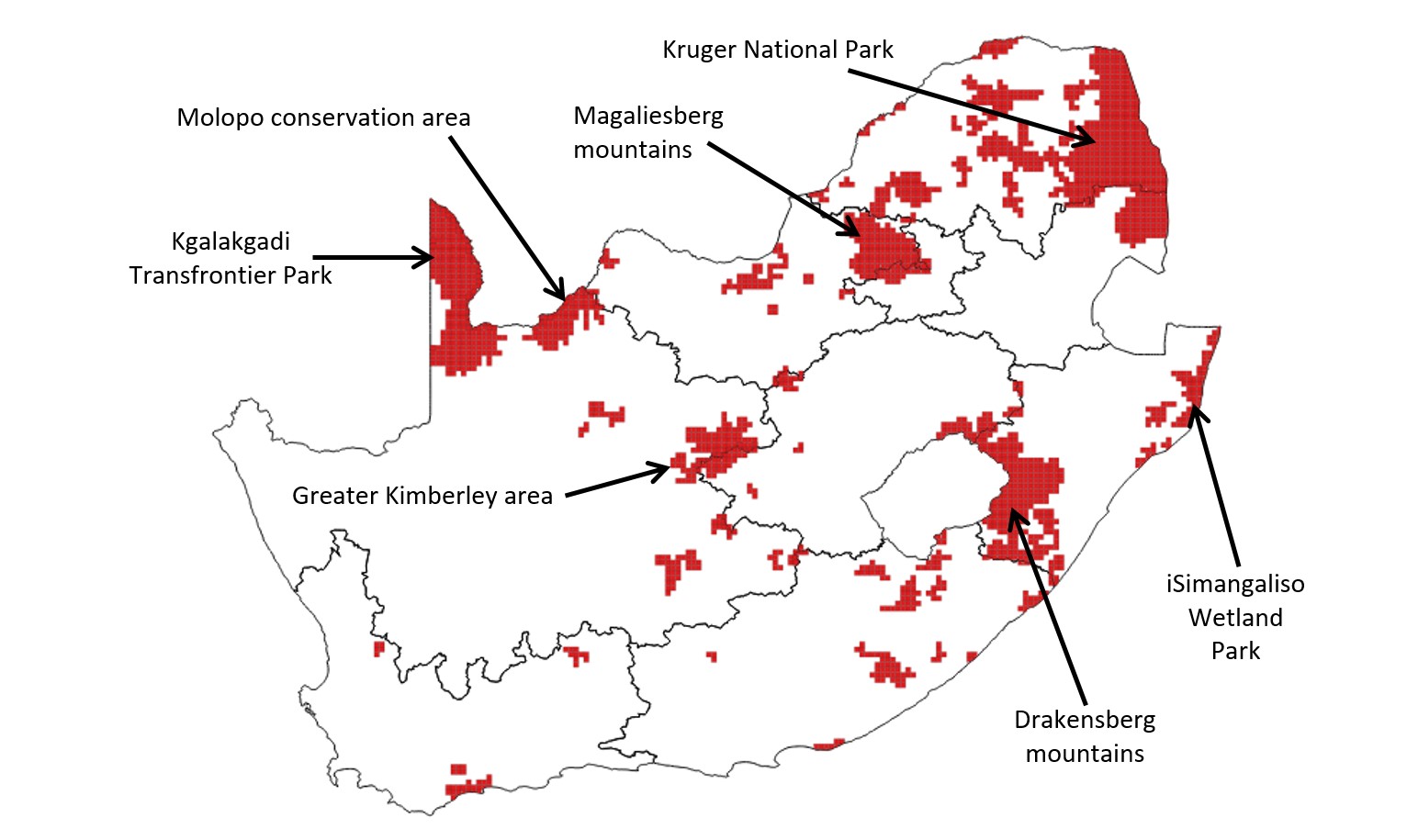 - [4] [4] Hijmans, R., Cameron, S., Parra, J., Jones, P., & Jarvis, A. (2005). Very high resolution interpolated climate surfaces for global land areas. International Journal of Climatology, 25, 1965-1978. [5] SANBI. (2015). 2013-2014 South African Nartional Land-Cover Dataset. Pretoria: South African National Biodiversity Institute. [6] Rutherford, M. (1980). Annual plant production-precipitation relations in arid and semiarid regions. South African Journal of Science, 76, 53-56. [7] Mucina, L., Rutherford, M., & Powrie, L. (Eds.). (2011). The Vegetation of South Africa, Lesotho and Swaziland (reprint). Strelitzia 19: South African National Biodiversity Institute. Pretoria. [8] Nel, J., Murray, K., Maherry, A., Petersen, C., Roux, D., Driver, A., Nienaber, S. (2011). Technical Report for the National Freshwater Ecosystem Priority Areas project. Pretoria: WRC Report No. 1801/2/11. [9] Acocks, J. (1988). Veld Types of South Africa. Memoirs of the Botanical Survey of South Africa, 57. [10] Crop Census, Western Cape Dept. Agriculture, 2013