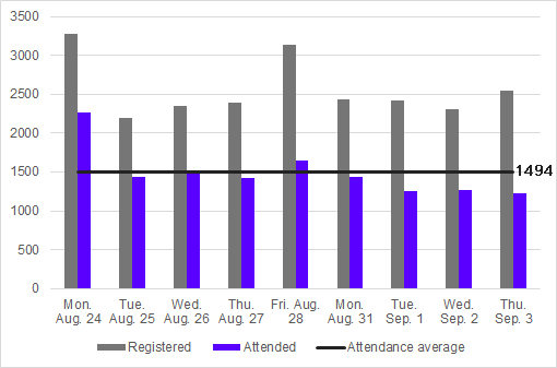 On the eve of the event, more than 2,500 paying attendees had registered (Figure 5), well beyond initial forecasts. 800 people attended the opening session live, and an average of almost 1,500 people logged on daily to the e-session (Figure 6). The number of participants in the various technical sessions averaged between 160 and 210 depending on the type of session, with peaks close to 300. Two Study Committees even broke their attendance records for face-to-face sessions.