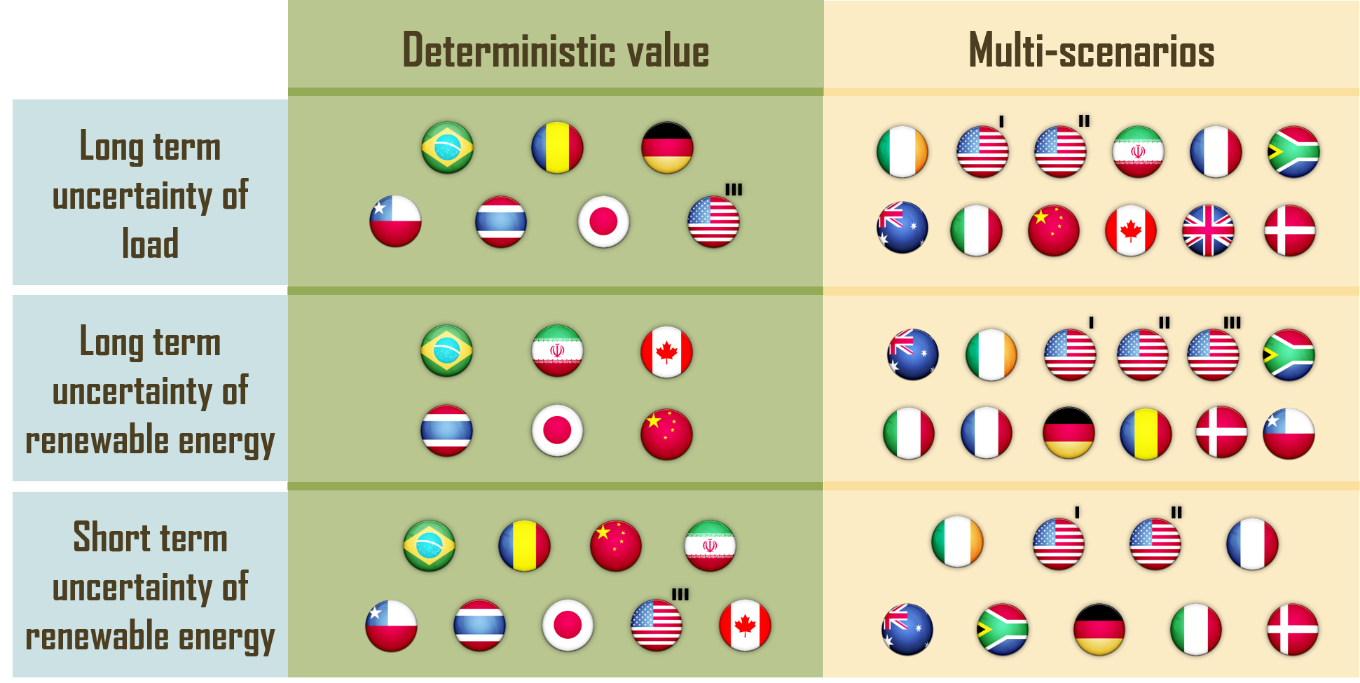 Chapter 4 reviews the methodologies addressing uncertainties in power system planning including the scenario-based model, risk-based model, and robust model. The applied uncertainty modelling methods for load and RE in each member country are also concluded in the chapter (Figure 3). For the long term uncertainty of load, most members conduct multiple scenarios to represent the uncertainty. For the short term uncertainty of renewable energy, the number of members who adopt deterministic value is slightly higher.