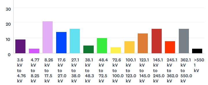 The survey on the application and user experience of capacitive switching devices returned 52 responses from utilities in 18 different countries from which only 38 responses provided sufficient data to be evaluated. Each respondent (utility) provided data on three to four voltage ranges so that the survey covers 146 different utility-voltage ranges, from 3.6 kV to 550 kV (Figure 1).