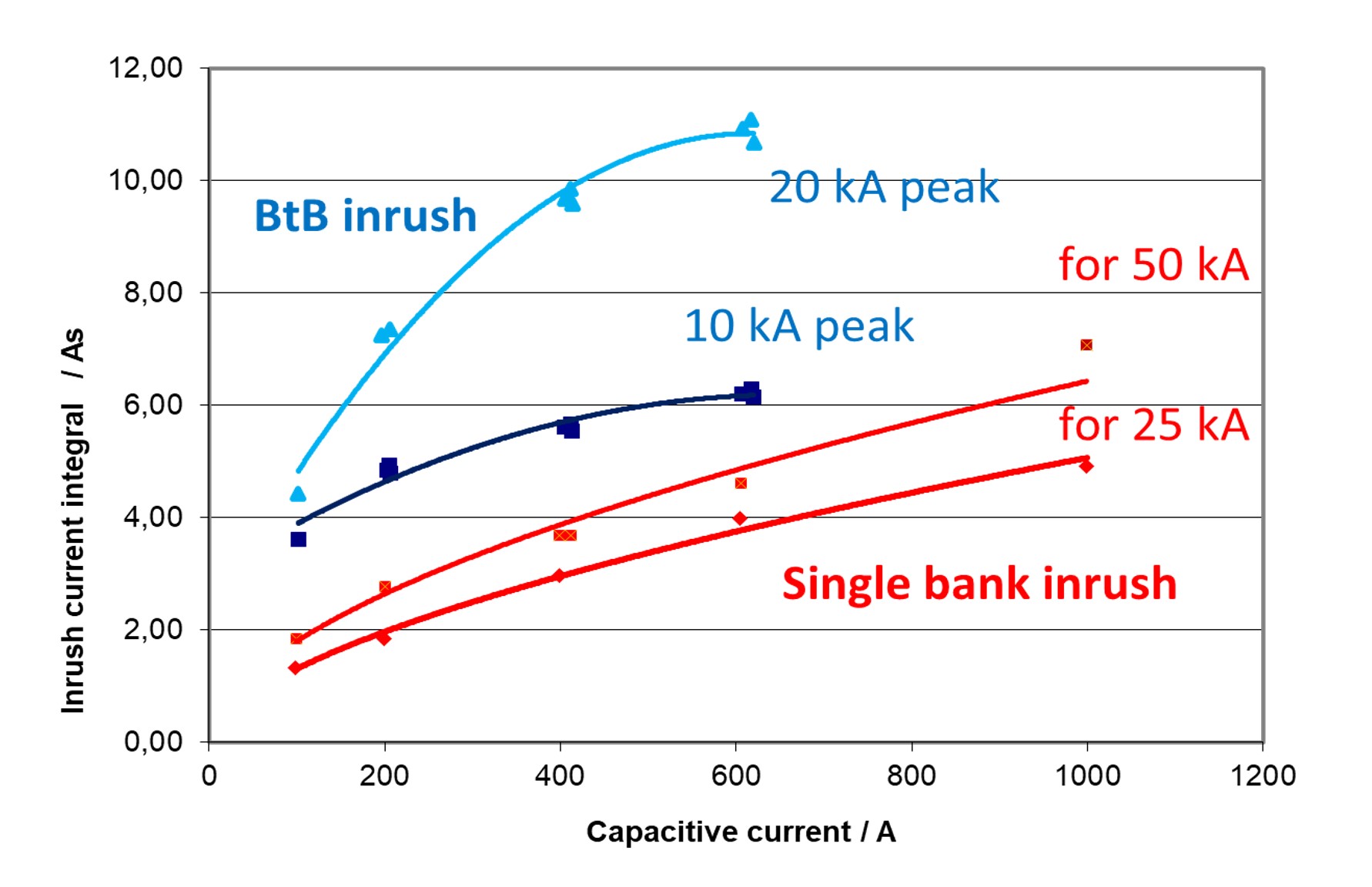 As long as the inrush current peak is smaller than the tested value, it can be assumed that the deterioration of the contact surfaces in a switching operation is smaller than in type tests where the highest inrush current peak (rated value) is applied. In particular, vacuum interrupters show an inverse relationship between peak inrush current and breaking performance. Therefore, peak inrush currents in excess of the rated and tested values cannot be permitted, unless it can be proven that the deterioration of the surface by higher inrush currents is lower than tested, which depends on the inrush frequency. Therefore, a new parameter was introduced i.e. the inrush current integral, ICI, which is an approximate indirect measure of the contact erosion. Figure 4 compares ICI values for back-to-back and single bank switching at different capacitive currents, however, common pre-arc duration and damping factor. Since capacitive current and inrush current peak are preset in Figure 4, inrush frequencies vary between 1400 Hz and even 16800 Hz for back-to-back switching and between 300 Hz and 950 Hz for single bank switching. Under the premises of equal or smaller ICI, the Working Group believes that an extension to higher peak inrush currents might be possible without negative impact on the switching performance. The benefit of alternative devices is to reduce the inrush current peak.