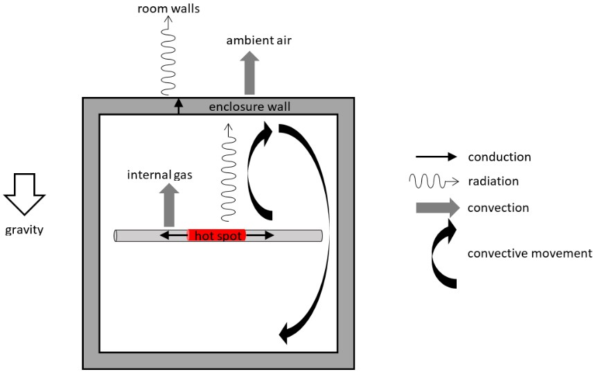 First, the heat transfer inside the enclosure is considered. Heat is transferred by conduction from the hot spots (e.g. contacts) to cooler parts of the current path (e.g. busbars and cables). The gas inside the switchgear is heated due to convective heat exchange with the current path. Buoyancy causes convective movement of the internal gas, which transfers heat to the inner walls of the enclosure. In addition, all parts inside the enclosure with an overtemperature will transfer energy to the inner walls of the enclosure by radiation.
