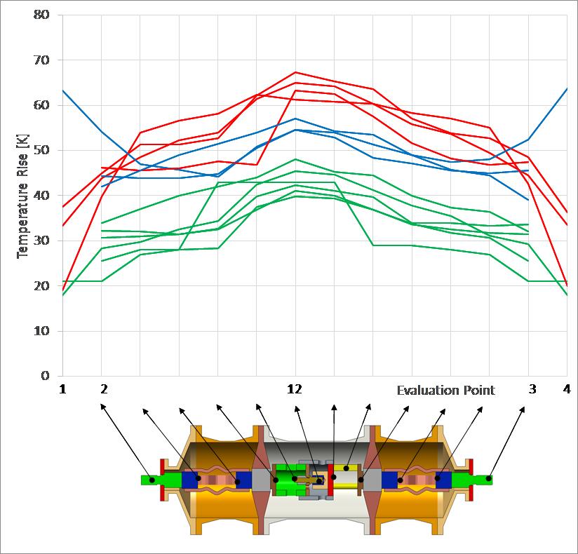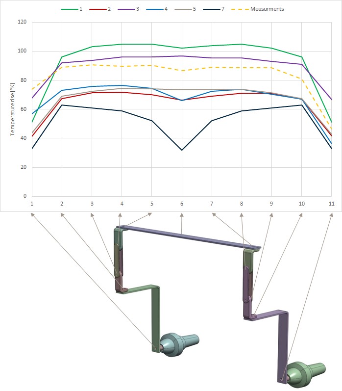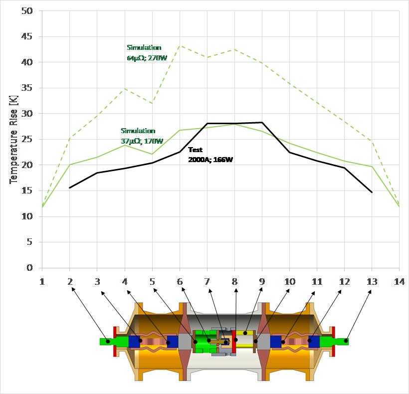 Figure 6 summarizes measured and simulated temperature rise on the MV test device. Results from two of the simulations have maximum temperature rise higher than the measured values. The other simulations have maximum temperature rise lower than the measurements. All simulated curves show similar temperature profiles as the measured result along the current path. The hot spot is in the region of the open/close knife contacts. However, it is a deviation between the lowest calculated hot spot 63 K to the highest calculated hotspot 105 K. The simulated temperature rise of the hottest spot was from 70 % to 117 % of the measured value of 90 K.