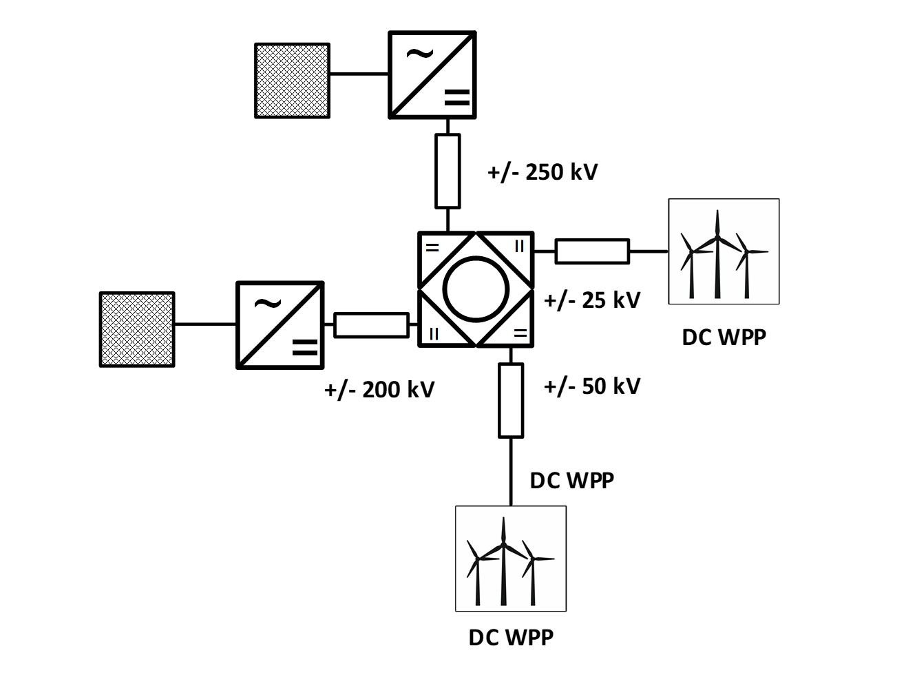 Figure 3 – 4-port DC hub for interconnecting 2 HVDC systems and 2 wind farms