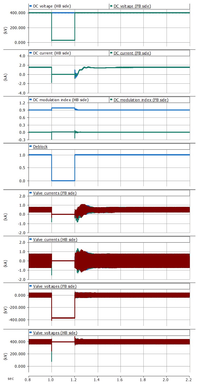 Figure 4 shows the simulation results of the non-isolated DC-DC converter test system from Figure 2 for a 200 ms worst case DC fault at the HV terminals (V1 side), which indicates that the fault is not transferred to the LV side and that internal variables are well-controlled (DC-DC is blocked).