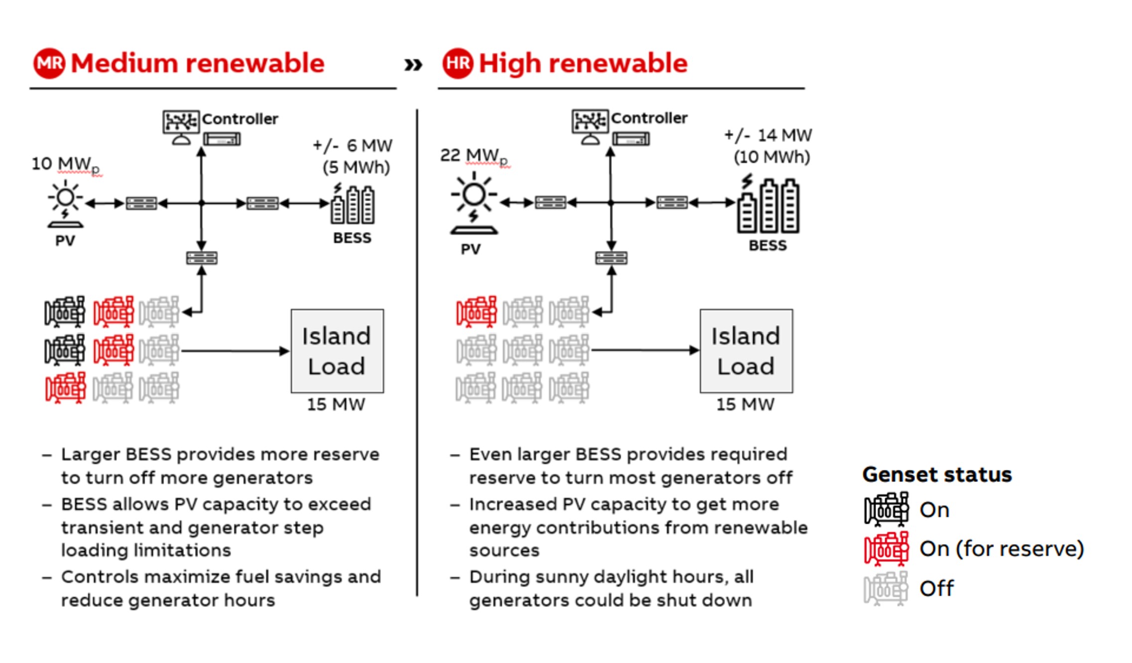 It is expected that off-grid power systems of the future will deploy more hybrid architecture (using various ESS systems) to increase the RE generation to almost 100%, both because of decarbonization of generation, as well as for economic reasons as this reduces consumption of fuel delivered at high cost. To achieve all this, the use of fast-acting, advanced control algorithms and features in both power balancing (dynamic power control) and voltage/var control will be necessary in future hybrid controlled power systems.