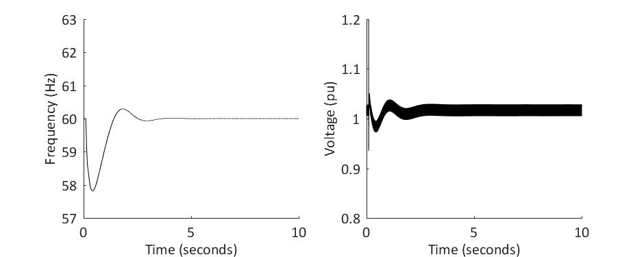 Security is assessed by identifying the largest acceptable disturbance to which the hybrid system can be subjected (often it is the direct connection or disconnection of the renewable generator) and simulating the response of the system and assessing if any equipment or system thresholds are exceeded. This continuous-time analysis must reflect the worst-case scenario for a large disturbance, and appropriate models of the equipment and controls found in the off-grid system must accurately reflect their operating dynamics. An example result of this study is shown in Figure 2, which shows the frequency and voltage of the plant bus after a loss of 256 kW of solar generation in the Old Crow off-grid system [6]. Safety is evaluated through the analysis of the protection system. Furthermore, reverse power flow and protection coordination must be evaluated.