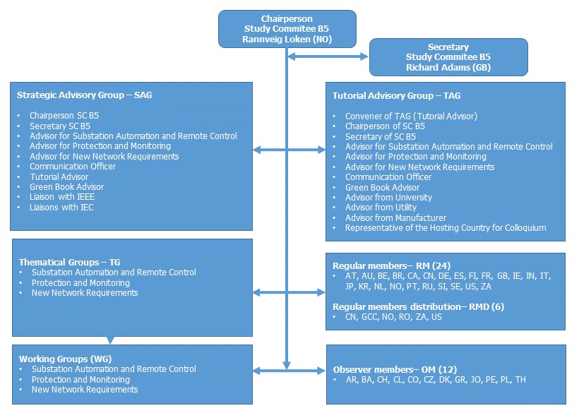 To attain its objectives, SC B5 is organized as shown on Picture 1. Five advisory groups support the decisions of the chair and secretary: the Strategic Advisory Group (SAG), the Tutorial Advisory Group (TAG), and three Strategic Thematic Groups (TG) specialized in Substation and Automation, Protection and Monitoring, and New Network Requirements, respectively. The Study Committee is formed by twenty-four regular country members, six additional regular members from distribution, twelve observer members, several Working Groups (WG) and Joint Working Groups with other Study Committees and organizations.