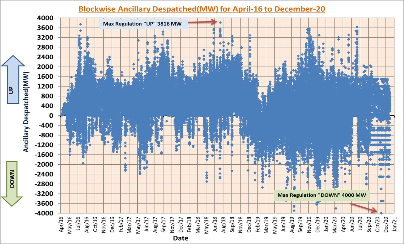 Tertiary control through utilization of undispatched surplus in regulated tariff generation projects is being done under Reserve Regulation Ancillary Services since 2016. Regulation ‘Up’ and ‘Down’ instructions are given for over 65 GW generation pan-India. The ancillary services dispatch since 2016 is depicted in Fig. 4, with both Up and Down instructions to the tune of 4 GW.