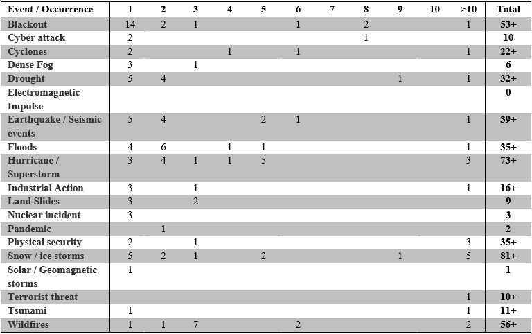 The survey identified that more than 90% of the respondents face HILF events in their electricity infrastructure. Table 1 provides an overview of the responses to the question of how often the respondent’s systems have faced specific HILF events since the year 2000. Creating Responses summed up and ranked by the number of occurrences showed that events caused by weather conditions have the highest incidence. Environmental events range between country to country and some specific events are more critical for some utilities compared to others. Man-made physical threats such as endangering physical security and terrorist threats have also ranked high for the respondent utilities. Nevertheless, from today’s experience, the general impact of natural physical threats can be expected to be higher compared to man-made physical threats. These threats and their ranking are in detail discussed in this Technical Brochure.