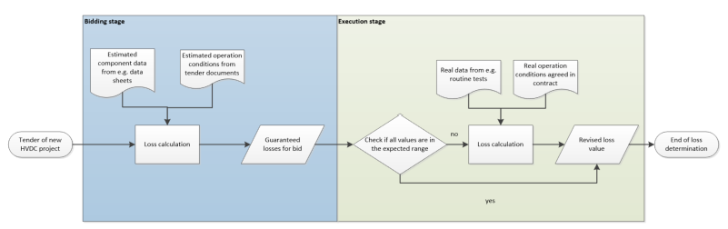 By using data from datasheets, previous projects, previous R&D tests and simulation, a loss calculation result can be obtained during the bidding process and used as the basis of a guaranteed loss figure forming part of the bid. If necessary, the loss calculations can later be repeated at the project execution stage, using data from the routine tests performed on the components actually supplied for the project. The overall process is illustrated in Figure 2 and Figure 3 below and the sources of information typically used at the bid stage and project execution stage are shown in the Table 1 below.