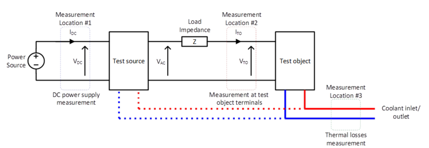 A generic operational valve type test set-up typically consists of a test object, which is coupled to a test source by means of a load impedance (usually an inductor). The test source is powered by a DC power supply which supplies the power losses in the entire test set-up. The test object and test source require liquid cooling which can be supplied from the same or separate cooling systems, depending on the choice of test source. The valve level or valve section losses measurements can be performed using the same operational valve type test set-up. The losses measurement locations are illustrated in the Figure 4 below.