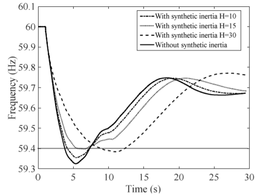 Such expected participation of variable IBRs in the economic dispatch will minimize greenhouse gas emissions, but at the same time will increase the reserve requirements to overcome the variability with flexible resources. Since the existing regulatory framework in Colombia is not allowing storage systems or behind-the-meter resources to provide the required flexibility services, hydropower will be the more likely alternative, leading to faster system dynamics and to new inertia requirements. Studies carried out by the system operator show that in scenarios with high penetration of IBRs, there is a need of synthetic inertia to avoid the activation of underfrequency load shedding schemes, as show in Figure 3.