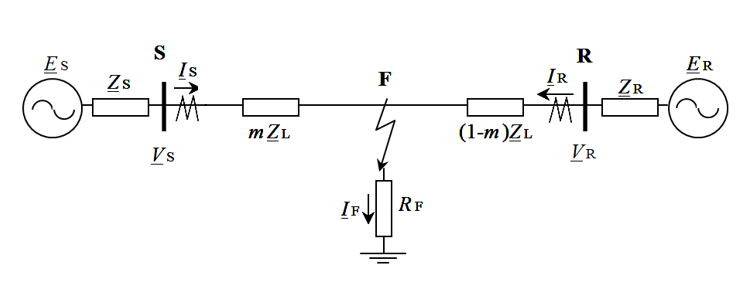 The simplest double-ended algorithms require voltage and current phasors acquired at the line ends, which are time synchronized using a Global Navigation Satellite System such as GPS or other similar systems. For circuits where the voltage and current phasors (and hence the symmetrical components) are synchronized, a simple double-ended algorithm can be adopted. This technique recognizes that the voltage along the line can be represented as a function of the distance to the fault. If there is only one fault, two equations can be generated from the line ends, equated, and solved. Consider the faulted network from Figure 1. Assuming that the measurements are synchronized, equations (1) and (2) define the voltage VF at the fault point F, as observed from each end of the line.