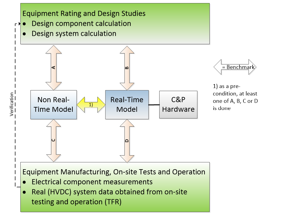 The goal of model validation is to establish a model and its chosen parameters to adequately represent the dynamic performance of the installed devices being modeled for power system studies. This statement, however, leaves significant room for interpretation on the meaning of “adequate” and “power system studies”. Hence, the main goal is to more clearly define these and then present an outline of possible methods for achieving model validation and at what point a model is considered valid for the HVDC system. An overview of possible validation paths is provided in the following figure.