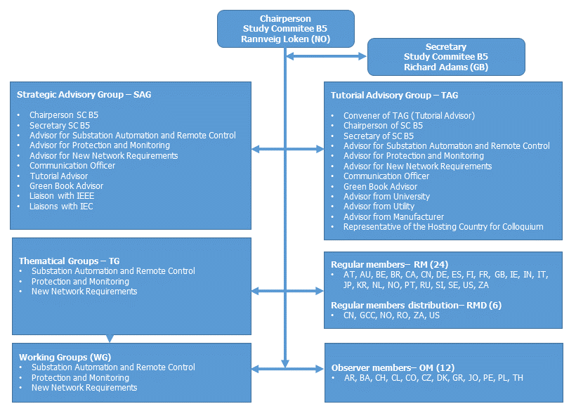 To attain its objectives, SC B5 is organized as shown on Picture 1. Five Advisory Groups support the decisions of the Chair and Secretary: the Strategic Advisory Group (SAG), the Tutorial Advisory Group (TAG), and three Strategic Thematic Groups (TG) specialized in Substation and Automation, Protection and Monitoring, and New Network Requirements, respectively. The Study Committee is formed by twenty-four regular country members, six additional regular members from distribution, twelve observer members, several Working Groups (WG) and Joint Working Groups with other Study Committees and organizations.