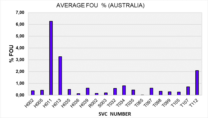 At the time this survey was performed there was no standard protocol for reporting the performance. As a result, each system used their own format for reporting. The technical brochure shows the performance of each system individually. For example, figure 1 shows the average Forced Outage Unavailability (FOU %) for each FACTS device in Australia.