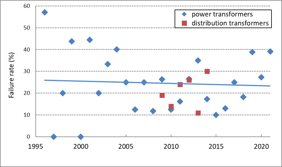 Figure 2 - Test-failure rates of distribution- and power transformers 1993 - 2021