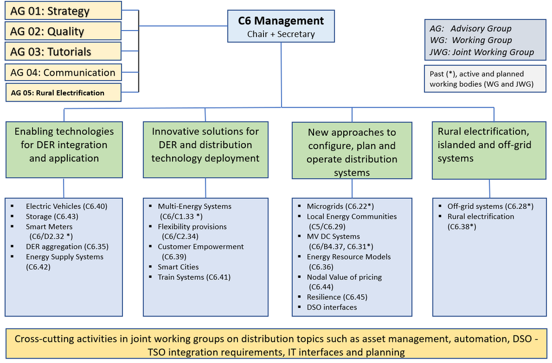 - Innovative solutions for DER and distribution system technologies and deployment (applications) – covered in JWG C6/C1.33 (multi-energy systems), JWG C5/C6.29 (local energy communities participating in markets), WG C6.39 (customer empowerment), WG C6.35 (DER aggregation platforms), JWG C6/B4.37 (medium voltage dc distribution systems), WG C6.41 (Technologies for Electrical Railway Distribution Supply Systems), WG C6.42 (Electric Transportation Energy Supply Systems), WG C6.44 (Nodal Value of Distributed Renewable Energy Generation).