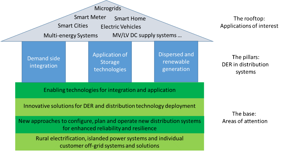 - Enabling DER technologies (pillars) – Distributed generation including conventional (diesel, gas turbines, CHP) generation sources, generation from renewable resources (wind and solar), energy storage systems (battery energy storage, thermal, chemical, and inertial storage), demand response programs (controllable and curtailable loads) and innovative equipment and systems for DER technology deployment (inverter interfaces).