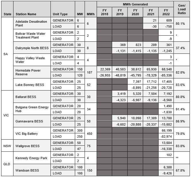 Table 1 - Registered BESS in the NEM and MWh Generation (and Consumption) (as at 1 Jul 2022)