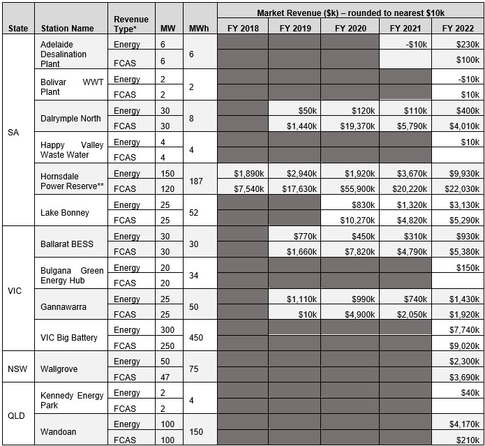 Table 2 - Registered BESS in the NEM and Net Energy& FCAS Revenue (as at 1 Jul 2022)