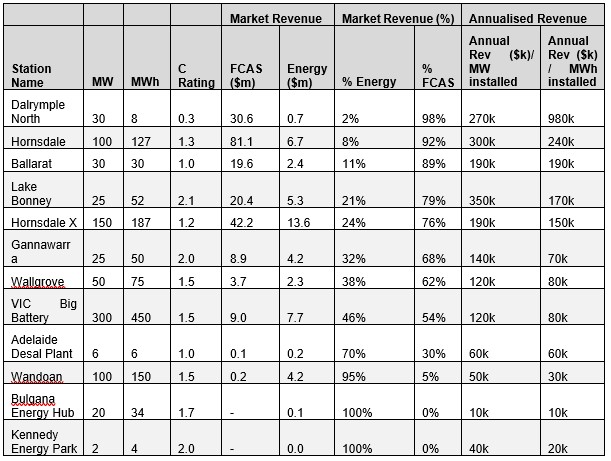 Most of the commissioned BESS in the NEM have been setup to be available in the Frequency Control Ancillary Services (FCAS) markets, a series of co-optimised primary and secondary frequency control elements with energy. Table 2 below shows recent annual market energy and FCAS revenue.