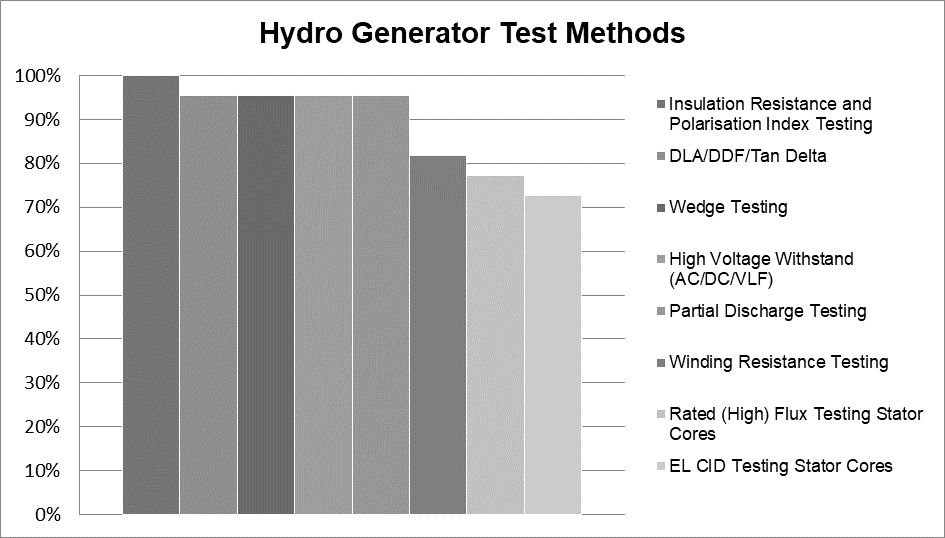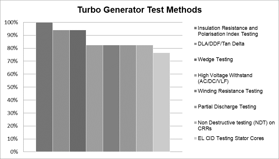 The most frequent test methods used on turbo generators are shown in Figure 3 and Figure 4 indicates most frequent test methods used on hydro generators. The percentages shown in tables are based on number of positive answers in all submitted questionnaires, for example all respondents indicated that they perform Insulation Resistance and Polarisation Index Testing.