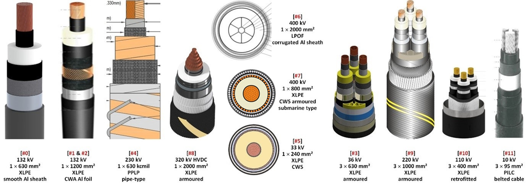 In total, 11 different case studies have been developed. The case studies consider a wide range of power cable types. The cases include 10 kV AC up to 400 kV AC cables and 320 kV HVDC cables, XLPE, SCFF and pipe-type cables for both land and submarine installations. Figure 1 provides an overview of all cable systems considered.