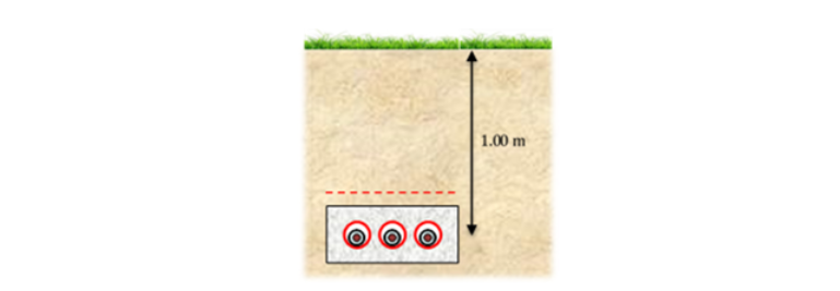 Also, there are varying laying conditions among the case studies, however the intent is that the cases remain sufficiently simple for illustration purposes. Configurations include single circuits in trefoil or flat formation, direct buried, in (special) backfill, in ducts, in troughs, in free air or in the sea floor. Figure 2 illustrates one of the considered laying conditions.