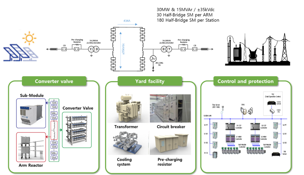 In Korea, KEPCO has launched an innovative project to install the first MVDC station at ±35kV which will be placed into commercial service for 30 MW of PV (photo-voltaic – solar) in 2023. The aims are to increase transmission line power capacity from AC 20 MW to DC 30 MW and to modify the regulation of insulation distance from AC 20m to DC 6m~7m; the consequent change in circuit configuration could permit KEPCO to triple the current power supply in the distribution system. By building such a novel system, relevant technologies and tools evaluating technical advantages have been achieved in many aspects including operational sequence in steady state, and the ripple effects from any malfunctions or transient states.