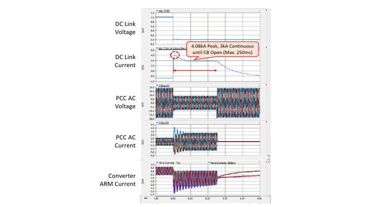 Figure 2 shows the voltage and current evolution at the system’s main components such as DC Link, converter arm, and PCC due to a DC short-circuit accident, i.e., the worst failure situation of MVDC converter system. It could be suggested that the fault duration time is 250 ms considering CB (circuit breaker) operation and BF (break failure) protection. Accordingly, this could be employed as the condition of a DC short-circuit test. The results also imply that the maximum instantaneous fault current is 4.08 kA, and 3 kA could be allowed to flow continuously until the fault is cleared. In this way, the converter is protected against any potential DC short circuit as the apparatus is designed to withstand fault currents.
