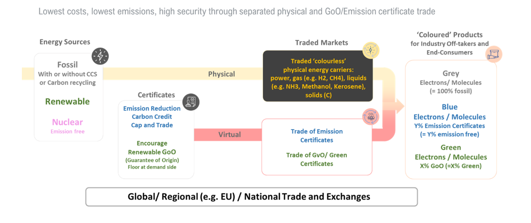 The expectation is justified that the potentially ‘net zero emission’ energy carriers, electricity (‘electrons’) and hydrogen, including E-fuels (‘molecules’), will be gradually taking over the dominant role of fossil carriers on the route to global energy supply without remaining greenhouse gases.