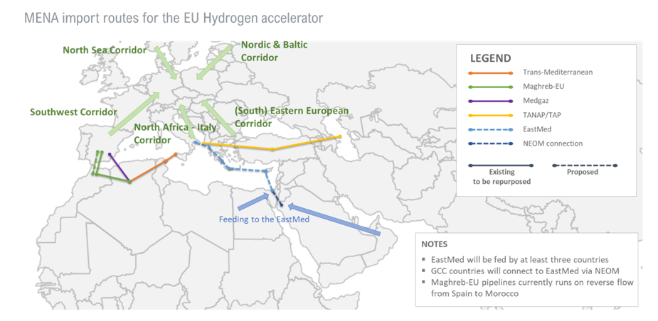 In the context of the EU hydrogen accelerator, the MENA would contribute to feeding the East Med import route under development.