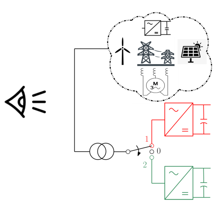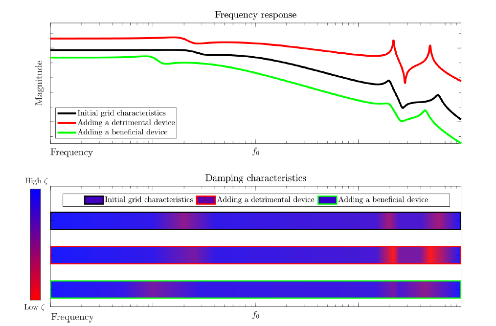The above mentioned requirement is encapsulated in the following example. Figure 1 illustrates the connection of a new device to an existing grid where the interconnected converter can be selected with different topologies, control strategies or control parameters, exemplified by the switch of 1 (red device) or 2 (green device). Figure 2 shows how two high-frequency resonances of the existing grid (black curve, selection 0 in Figure 1) are being amplified (red curve) or damped (green curve) by the addition of the new device. The increased damping after the connection of the beneficial device implies reduced risk of high-frequency unstable interactions.