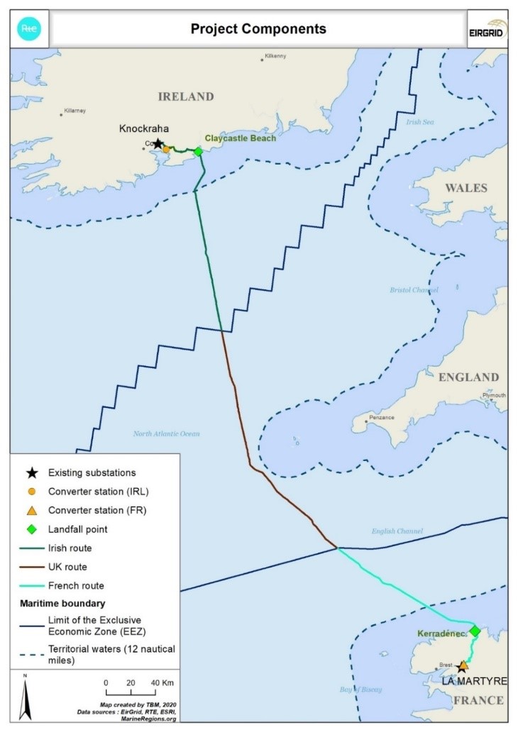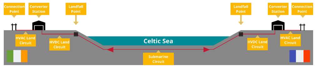 On land in Ireland and France consents were required from the respective planning authorities for the land cable route and converter stations. Additionally, marine consents were required for the cable and laying of the cable and any required protection in the territorial waters of Ireland and France, and in the EEZs of Ireland, the United Kingdom, and France.