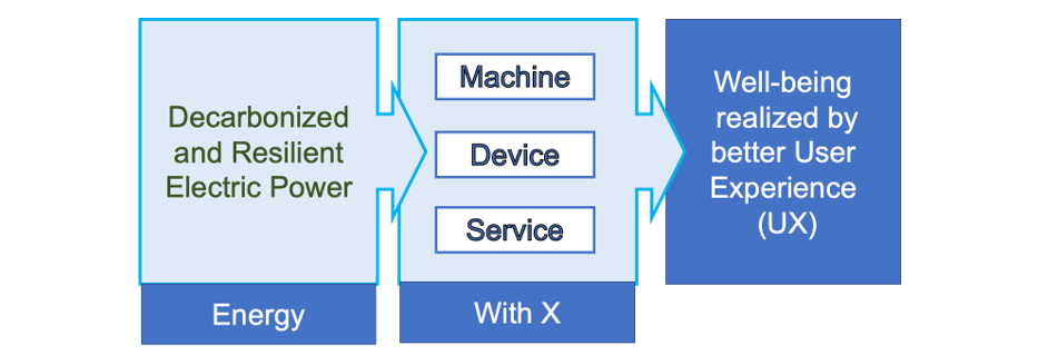 The next thing I would like to point out is the concept of "Energy with X" (energy is with all industries and human beings). Energy supply is very important, but we must first return to the goal of bringing wellbeing through better user experience (UX). It is the machines, devices and services that provide the better UX, and energy is provided only as an intermediate good. We need to think of everything from the user's point of view and from a human-centered perspective. The energy needed for this must be carbon neutral and resilient, and the matching of power sources and demand will become an increasingly important issue as distributed renewable energy increases. In other words, interactive energy management technologies are needed.