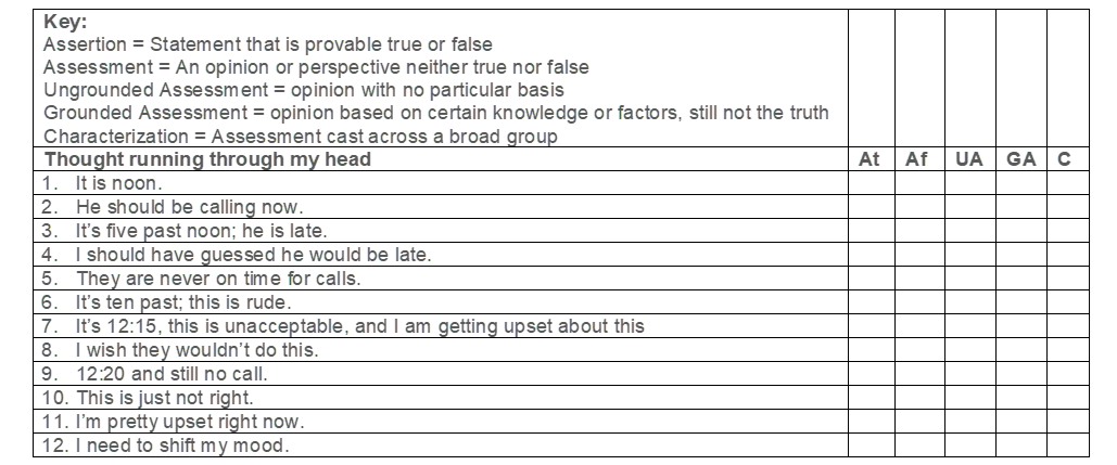 Note that many of the assessments I ended up making were from a background mood of resentment of past lateness. My mood was influenced by my assessments, and my mood!