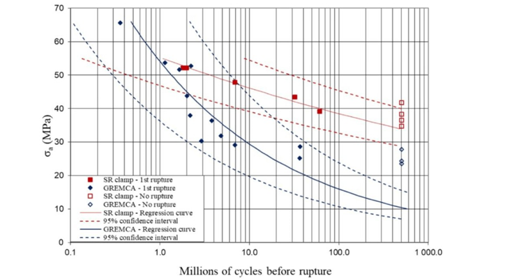 Figure 4 - ACSR Crow S-N fatigue curves with different clamp configurations [Paradis and Van Dyke, 2020]