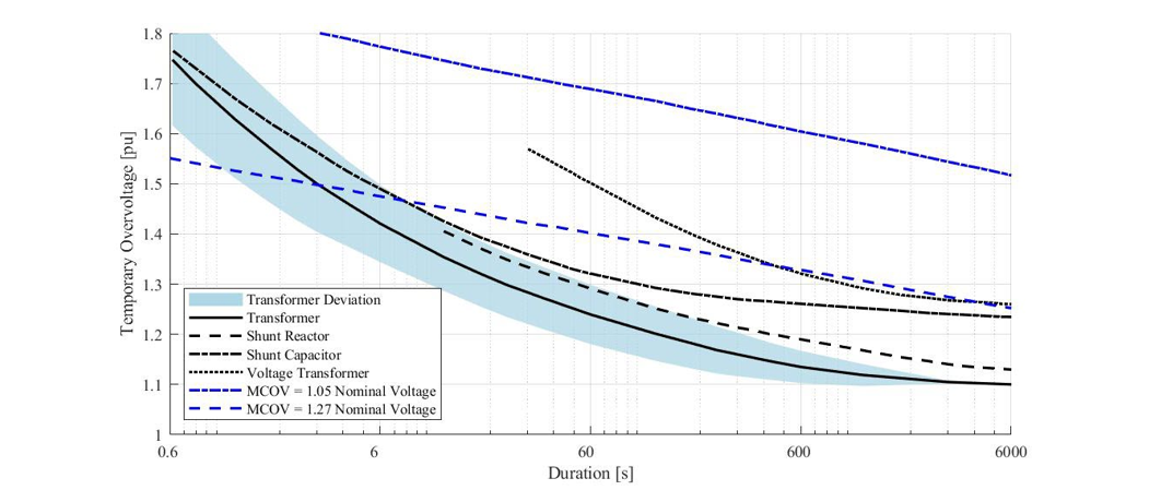 It is expected that the duration of a TOV affects the withstand characteristic and this was recognised by CIGRE in 1998 with the publication of the withstand voltage curves (Figure 1) as a function of time for different equipment (in, “Temporary Overvoltage Withstand Characteristics of Extra High Voltage Equipment”, ELECTRA 179).